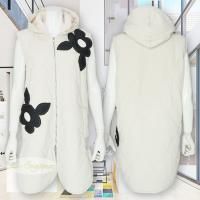 立体的なお花のモチーフがアクセントになった、花柄ステッチのフード付きキルティングロングコートです。