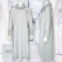 フェルト調の起毛素材とリブニットのコンビモチーフ、ドルマンスリーブのハイネックワンピースです。立体的なお花、レース花飾りがアクセントになっています。