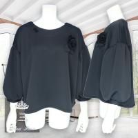 立体的なお花のモチーフ、ネックラインの小花飾りがアクセントになった、ゆったりシルエットのプルオーバーです。