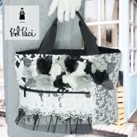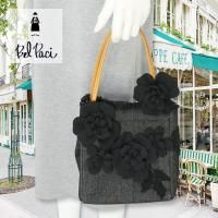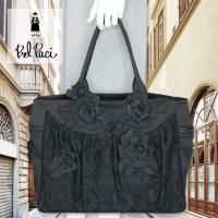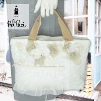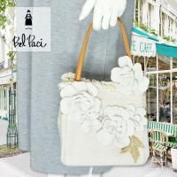 立体的なお花のモチーフ、、レース花、チュールネットドレープが特徴的な、レーシーバッグです。