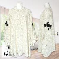 立体的なお花のモチーフがアクセントになった、透け感のあるペーズリー、ドット柄のチュニックです。