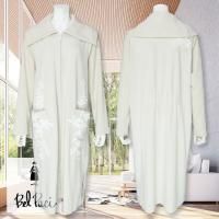 ポケット部分のフリル、パールプラーが特徴的な、コートワンピースです。バックのボトムはフレアを多めに入れてあります。