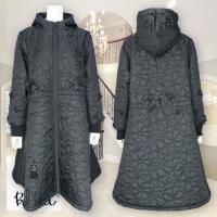 立体的なお花のモチーフがアクセントになった、花柄ステッチのフード付きキルティングロングコートです。
