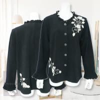 立体的なお花のモチーフ、ネックラインのメローモチーフが可愛いカーディガンです。