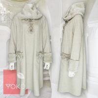 立体的な小花飾りが可愛いコートです。ウエストにコードベルトが付いています。袖口は内側に開いていて独特なシルエットを作っています。